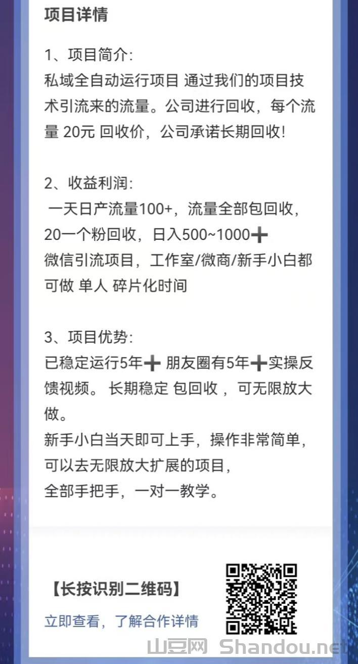 私域全自动运行项目通过我们的项目技术引流来的流量。公司进行回收,每个流量 20元回收价,公司承诺长期回收!