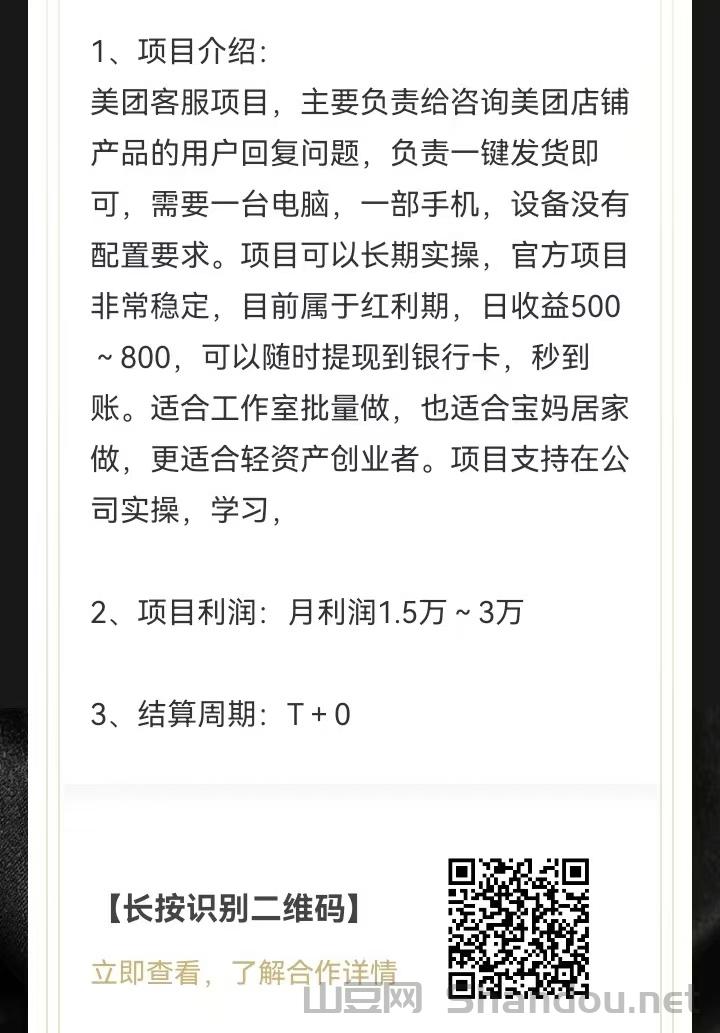 正文 美团客服项目,月收益2W+,长久稳定,工作室可批量复制 AR项目网 V管理员 /01-04/29阅读/0评论 0104 1、项目介绍:美团客服项目,主要负责给咨询美团店铺产品的用户回复问题,负责一键发货即可,需要一台电脑,一部手机,设备没有配置要求。项目可以长期实操,官方项目非常稳定,目前属于红利期,日收益500~800,可以随时提现到银行卡,秒到账。适合工作室批量做,也适合宝妈居家做,更适合轻资产创业者。项目支持在公司实操,学习,2、项目利润:月利润1.5万~3万3、结算周期:T+0【长按识别二维码]立即查看,了解合作详情
