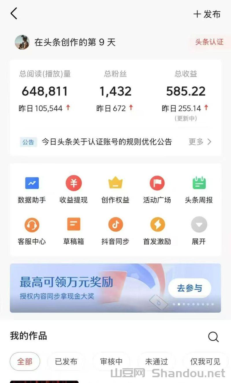 正文 今日头条零撸平台免费提供视频 AR项目网 V管理员 /01-04/40阅读/0评论 0104 今日头条零撸平台免费提供视频,大家记得坚持发视频,平台提供视频你只需要把视频保存下来发到头条号即可,有流量就有收益55分成保存图片微信扫码注册填写邀请码6573然后去授权头条号,完了领视频发布就行,推广好友来发还能赚佣金