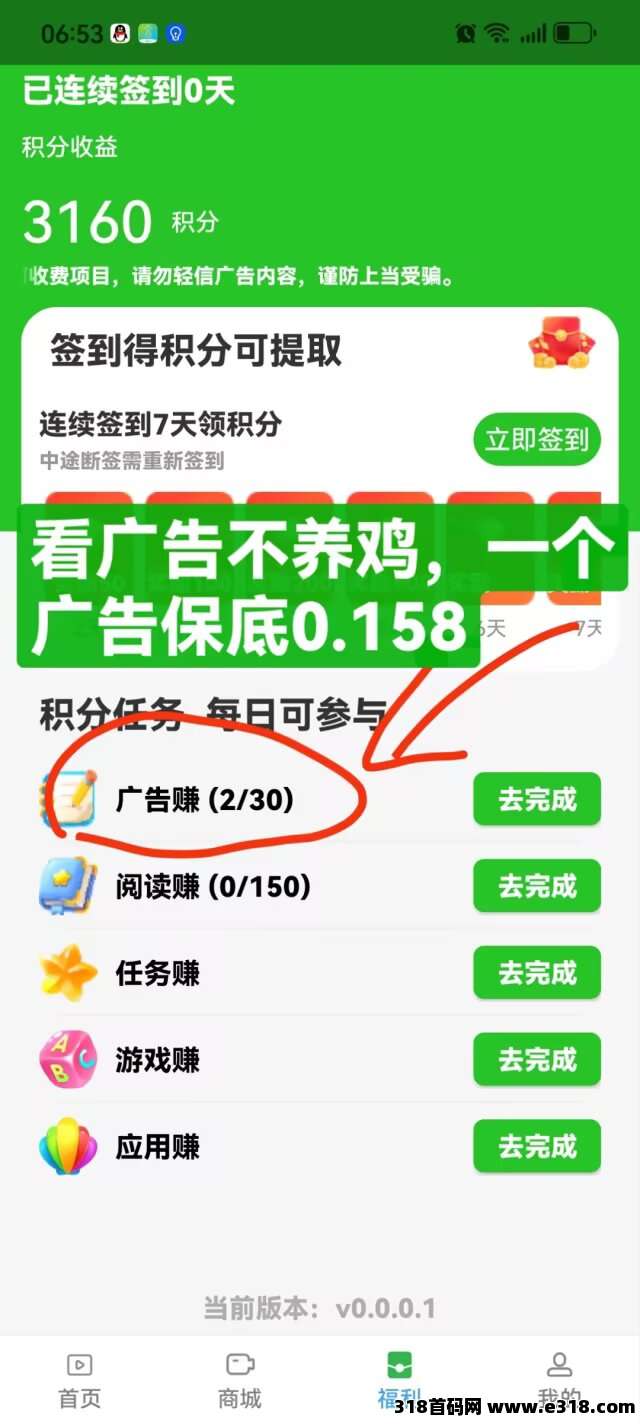 2.登录后点福利去看广告,一天最多看35个广告,阅读文章也可以做。每天保底大概5-6元